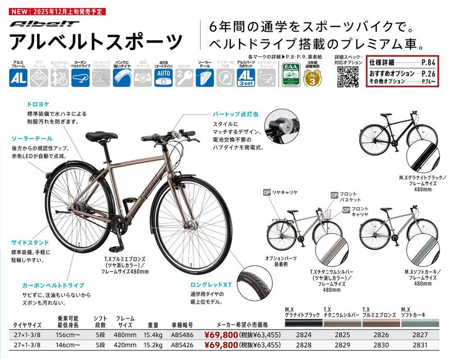 ブリヂストンサイクル、丸石サイクル、ミヤタサイクルの2026年カタログを入手しています。部数が少ない為、カタログ貸し出し(1週間程度)で対応しております。 - 《通学用自転車におススメ》12月24日新発売『MIYATA SUN ROSE V Belt(サンローゼ V ベルト)』の詳細はこちら