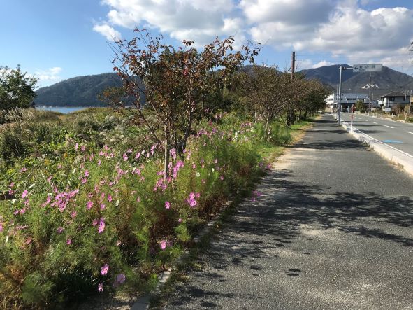 交通量の多い国道9号線を避けたいので、交差点を渡り踏切も越えて、しばらく田園を走ります。