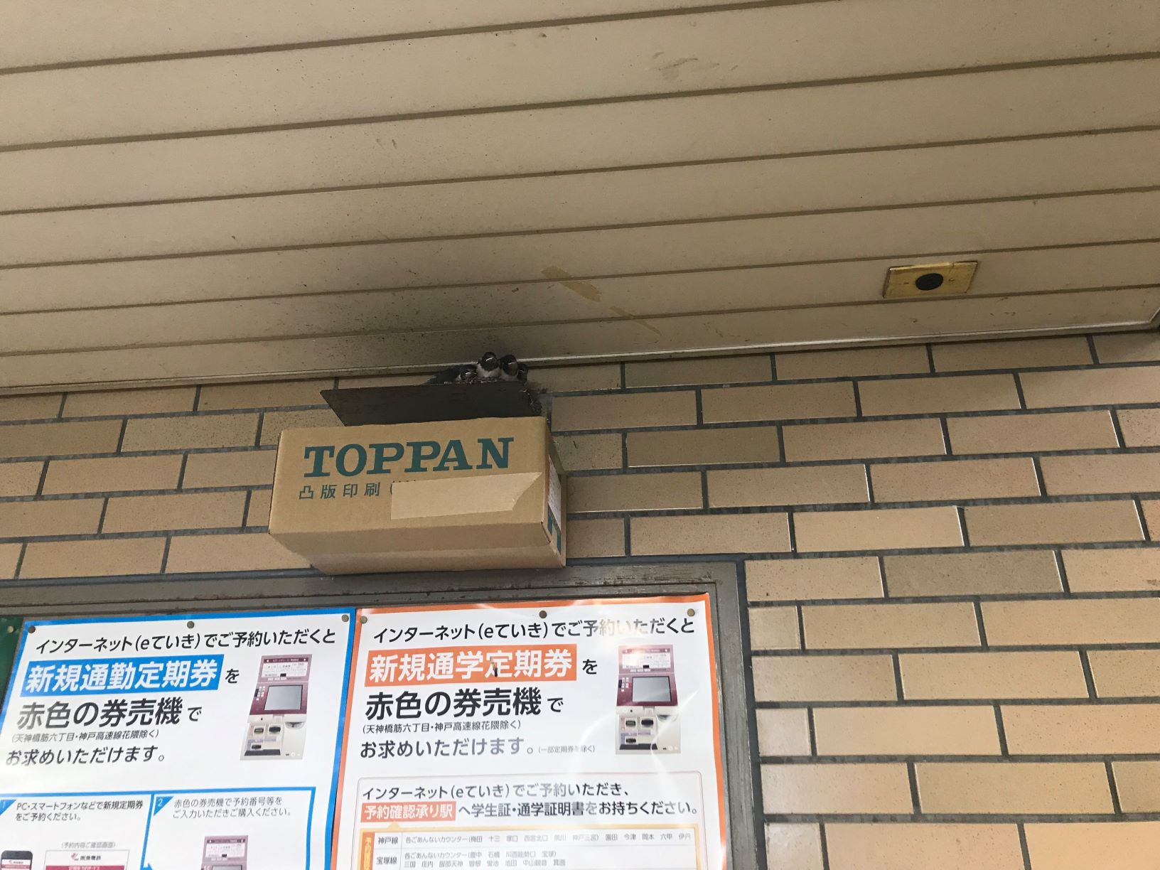 中山寺最寄りの駅阪急中山観音駅です。ツバメが巣を作っていました、鉄板のようなものの上に作っていたのですが、結構雑な巣で、ほとんどひな(かなり大きくなってはいますが)の体が丸見えでした。駅員さんがふんがおちないように箱を設置されているようです。
