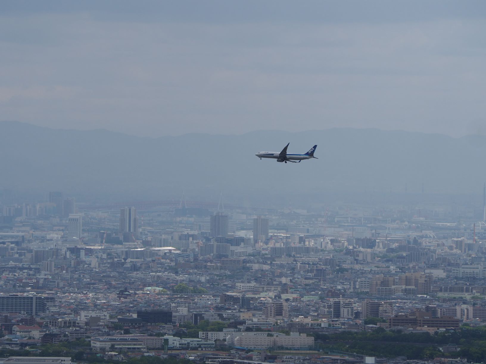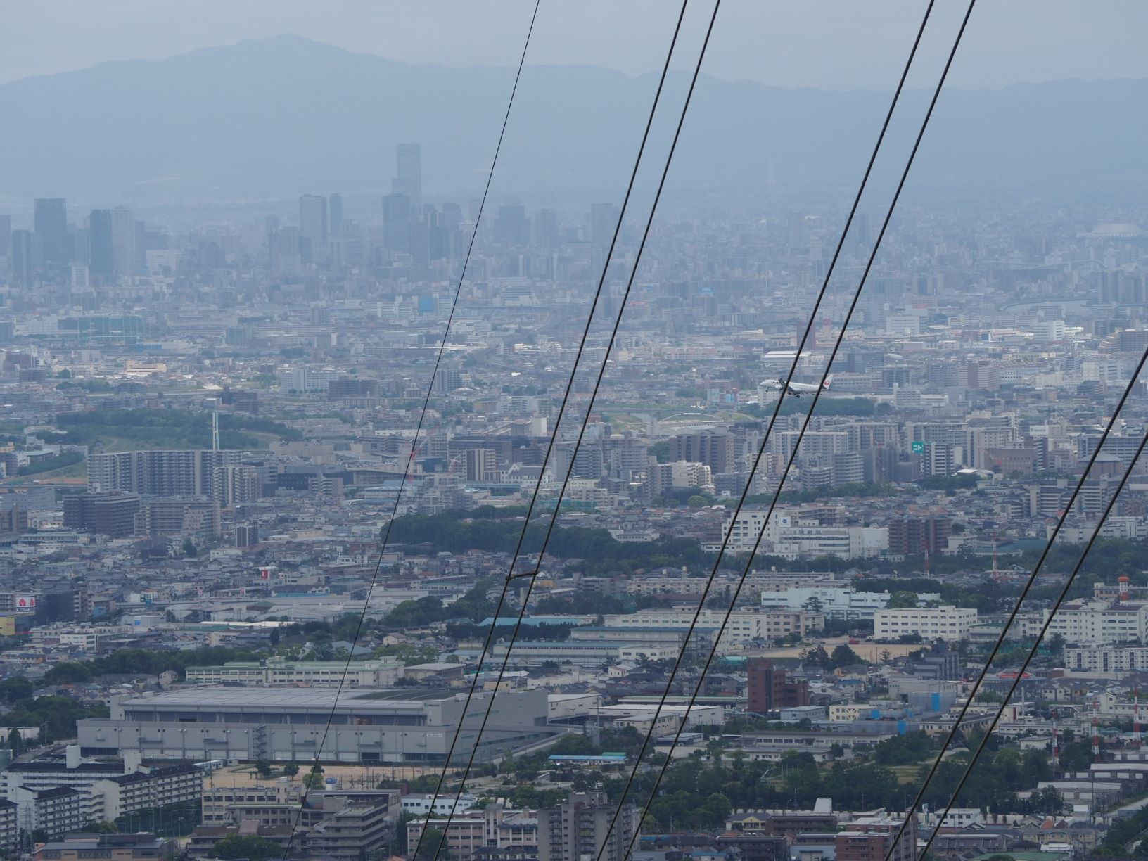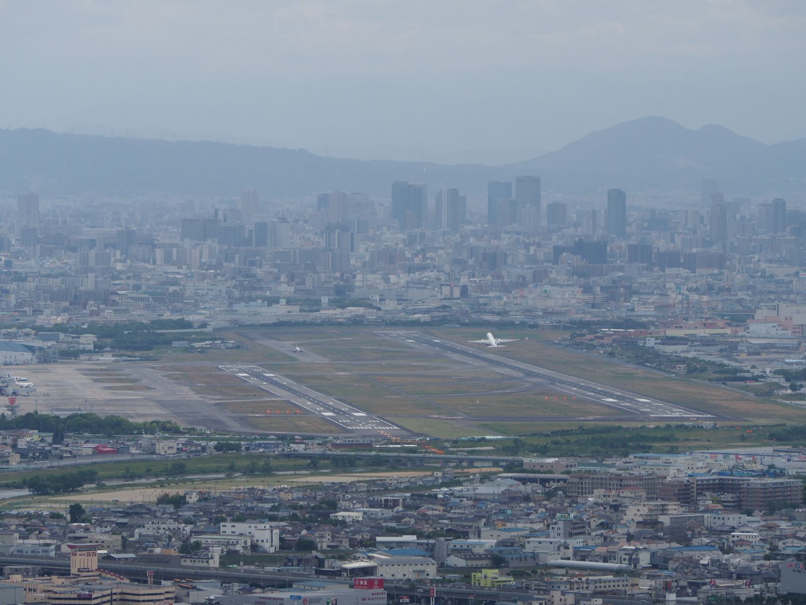 このあたりから、伊丹空港などを含めた街並みが見えてきます。ちょうど伊丹空港に着陸する飛行機が飛んでいました。