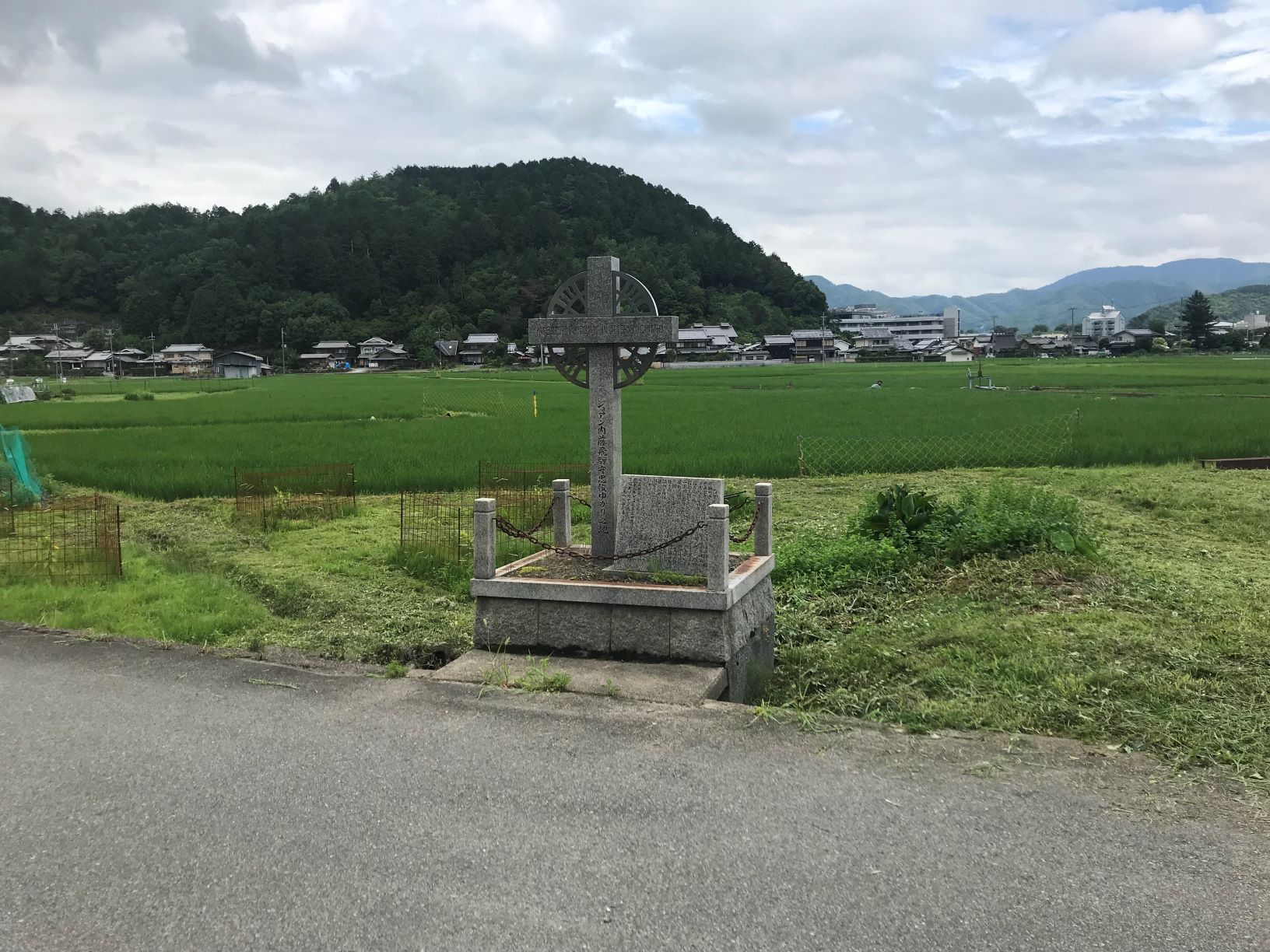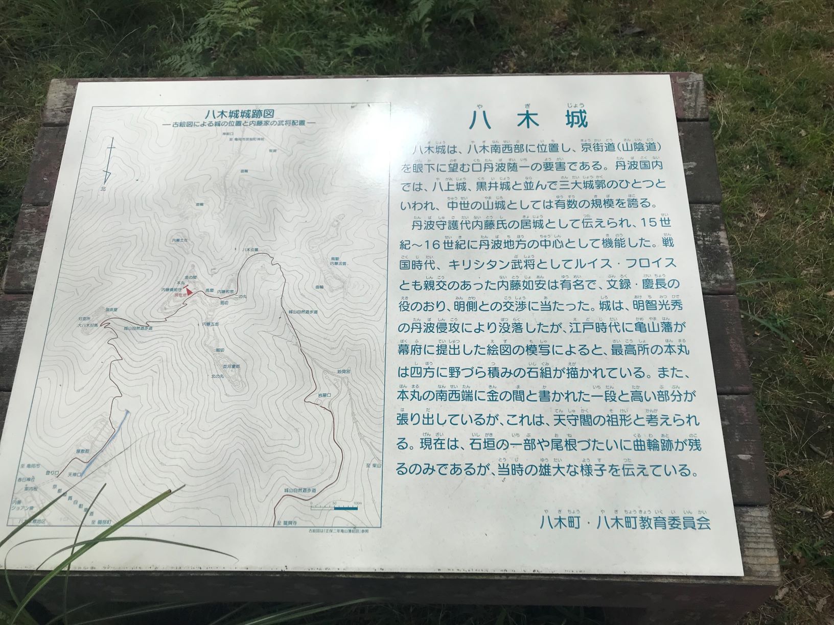 - 八木駅から徒歩10分あたりのところに『ジョアン内藤飛騨守忠俊顕彰碑』があります。そのすぐ近くに京都縦貫道の高架が見えるので、そのトンネルを通りぬけるとすぐに城山の登山道があります。頂上には八木城跡があり、亀岡盆地や大堰川の景色がきれいに見れます(標高:約330m)