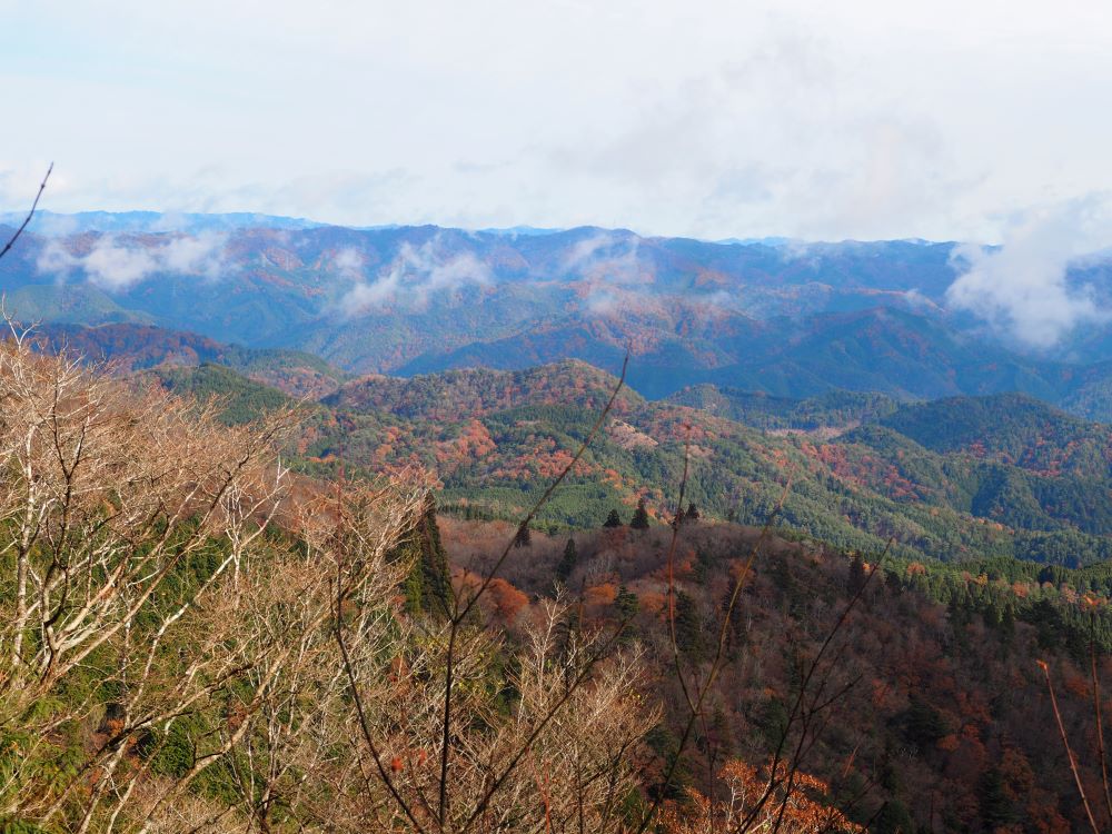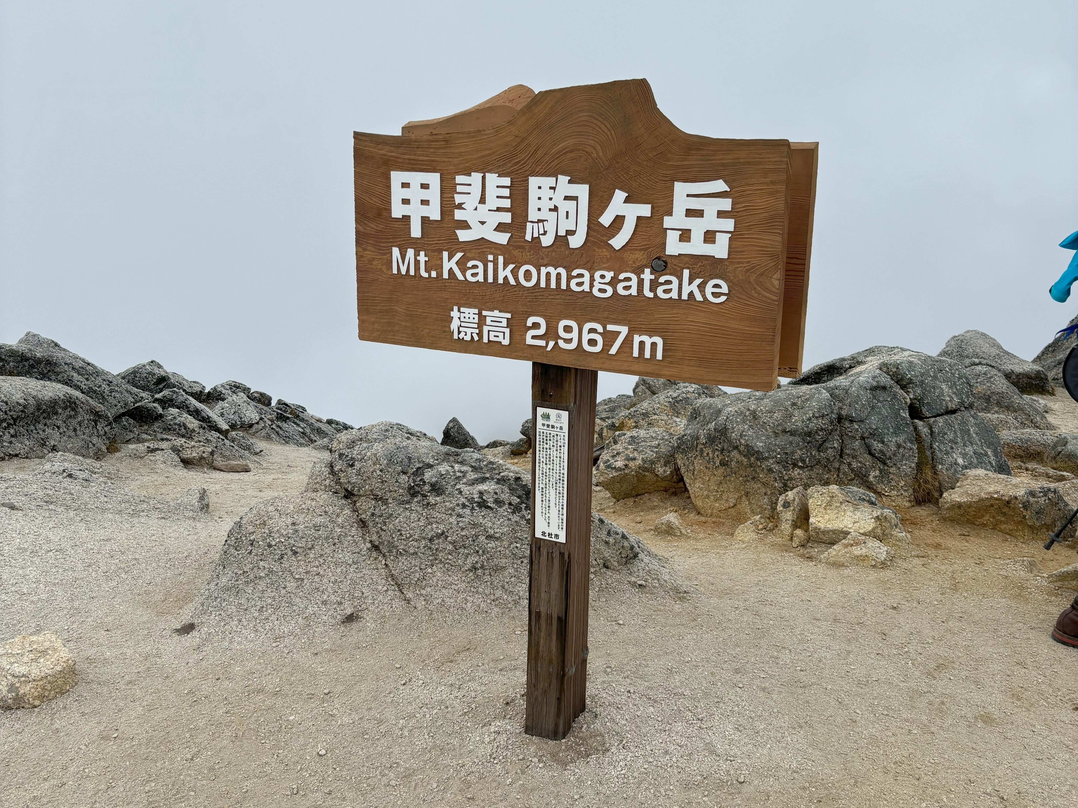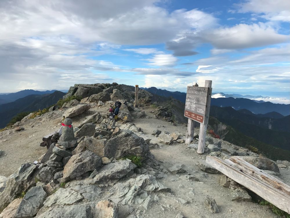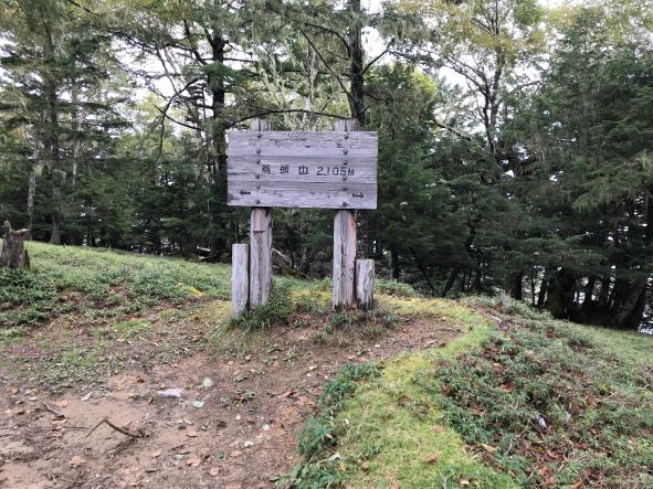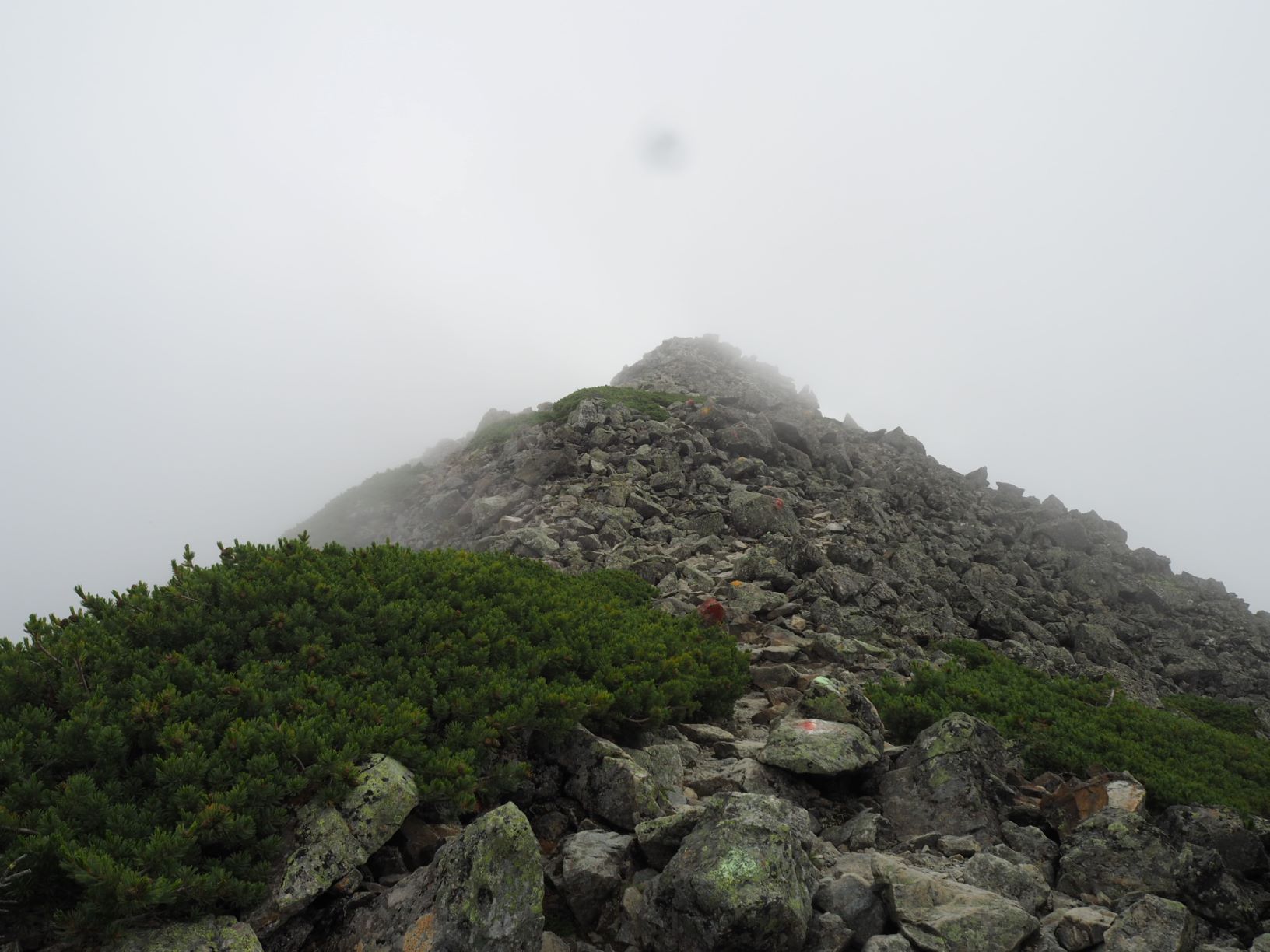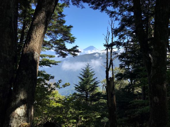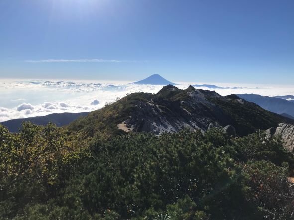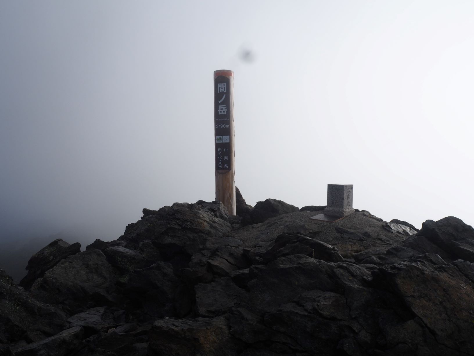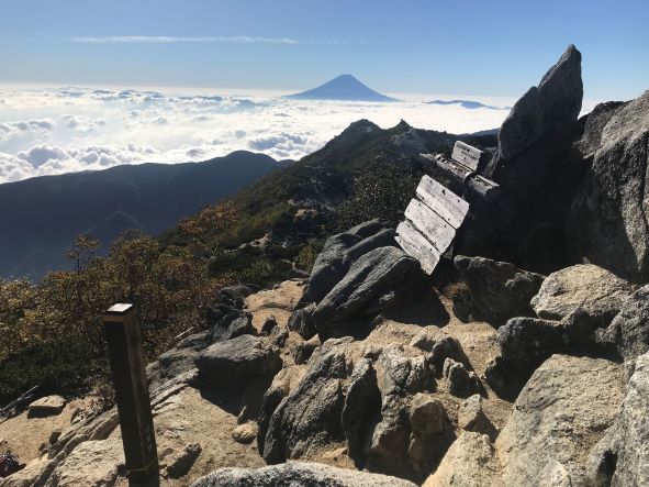間ノ岳山頂に到着しました。晴れてきていましたが、あいにく富士山方向は霧におおわれて見えませんでした。