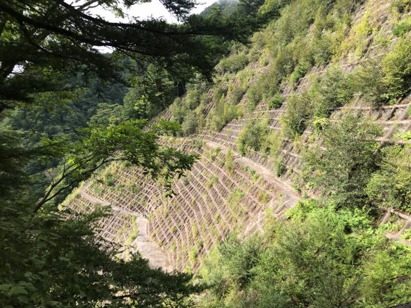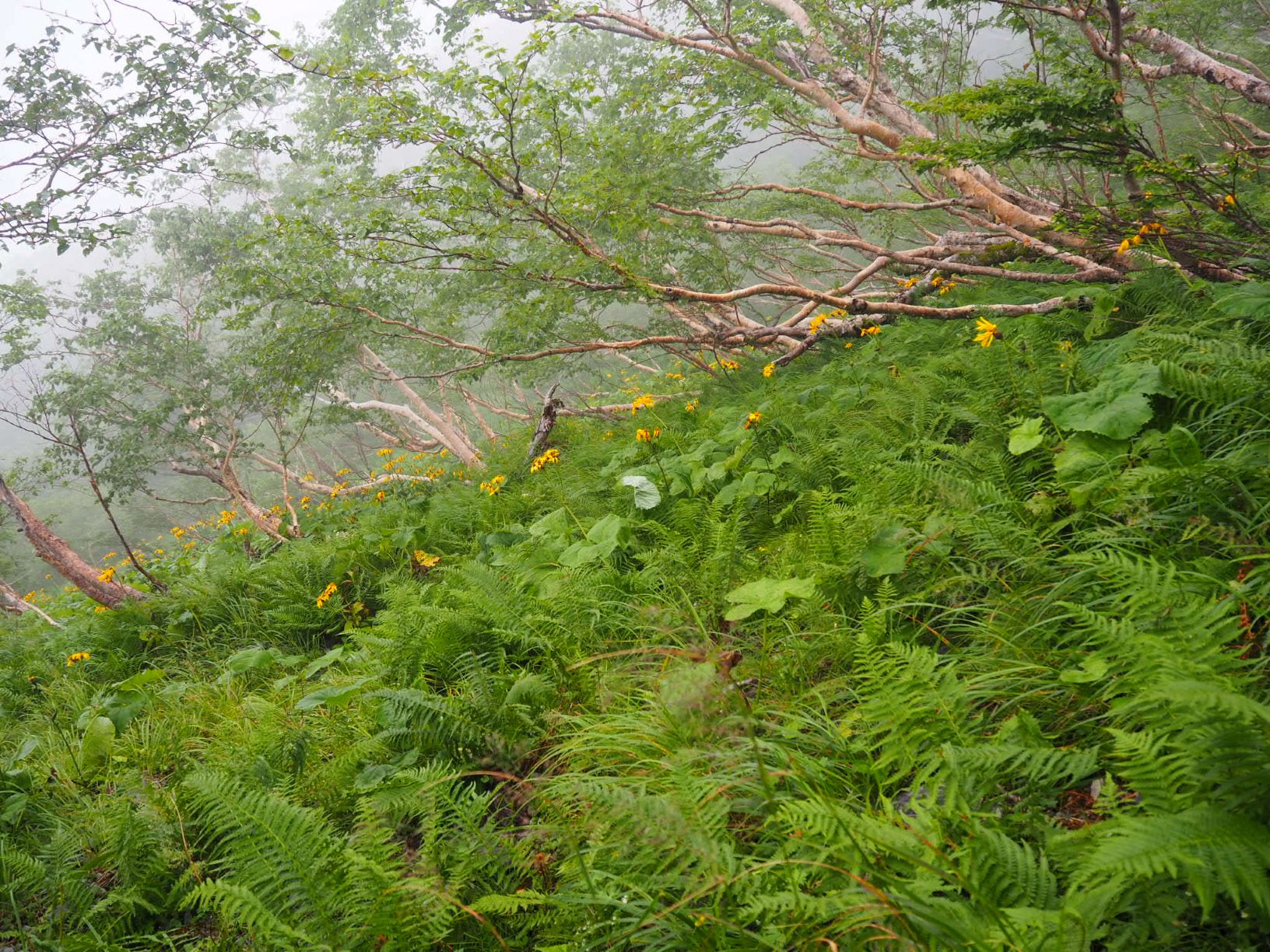 草スベリまで戻ってきました。ここで雨に降られてしまいました。こんなに急な坂をよく登ったなと考えながら、必死で下って行きました。