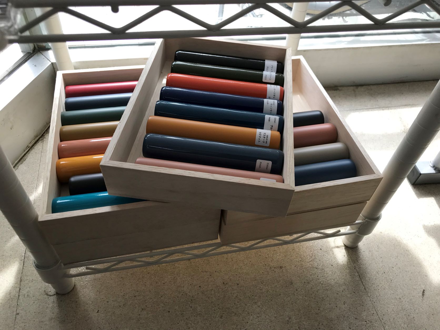 店舗在庫とは違うカラーをお取り寄せ頂く場合もこのように色見本パイプを見比べて頂くことで、実際のフレームでの色合いを確かめてからご注文頂けます。