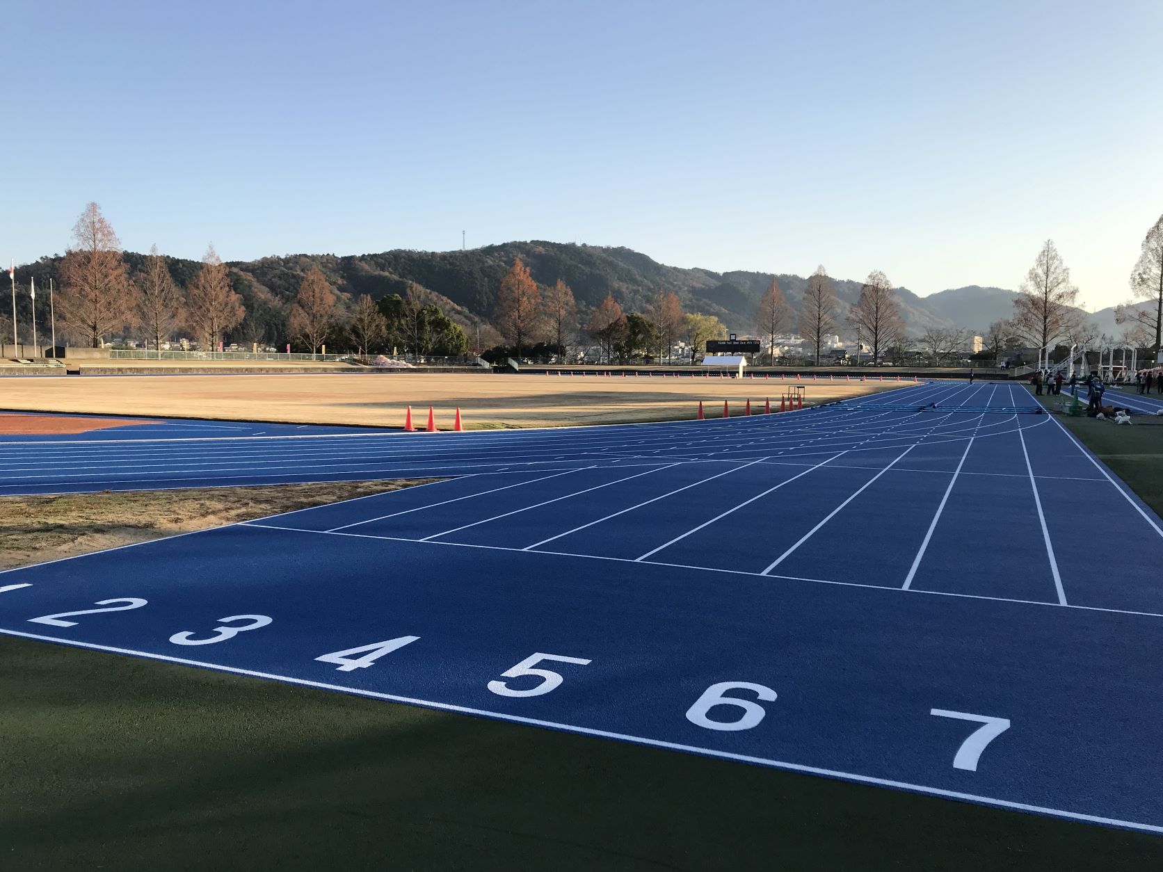 亀岡運動公園競技場のトラックは改修されて、『ブルータータン』とよばれる青いトラックになっていました。
