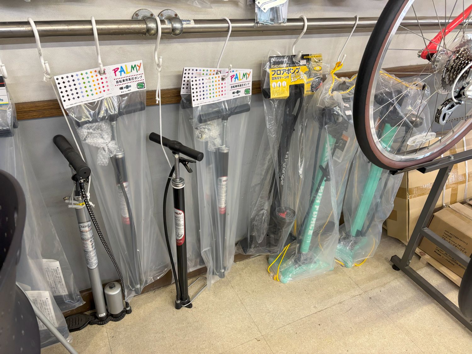 英式用空気入れ2本、仏式、米式対応メーター付き空気入れ2本置いています。