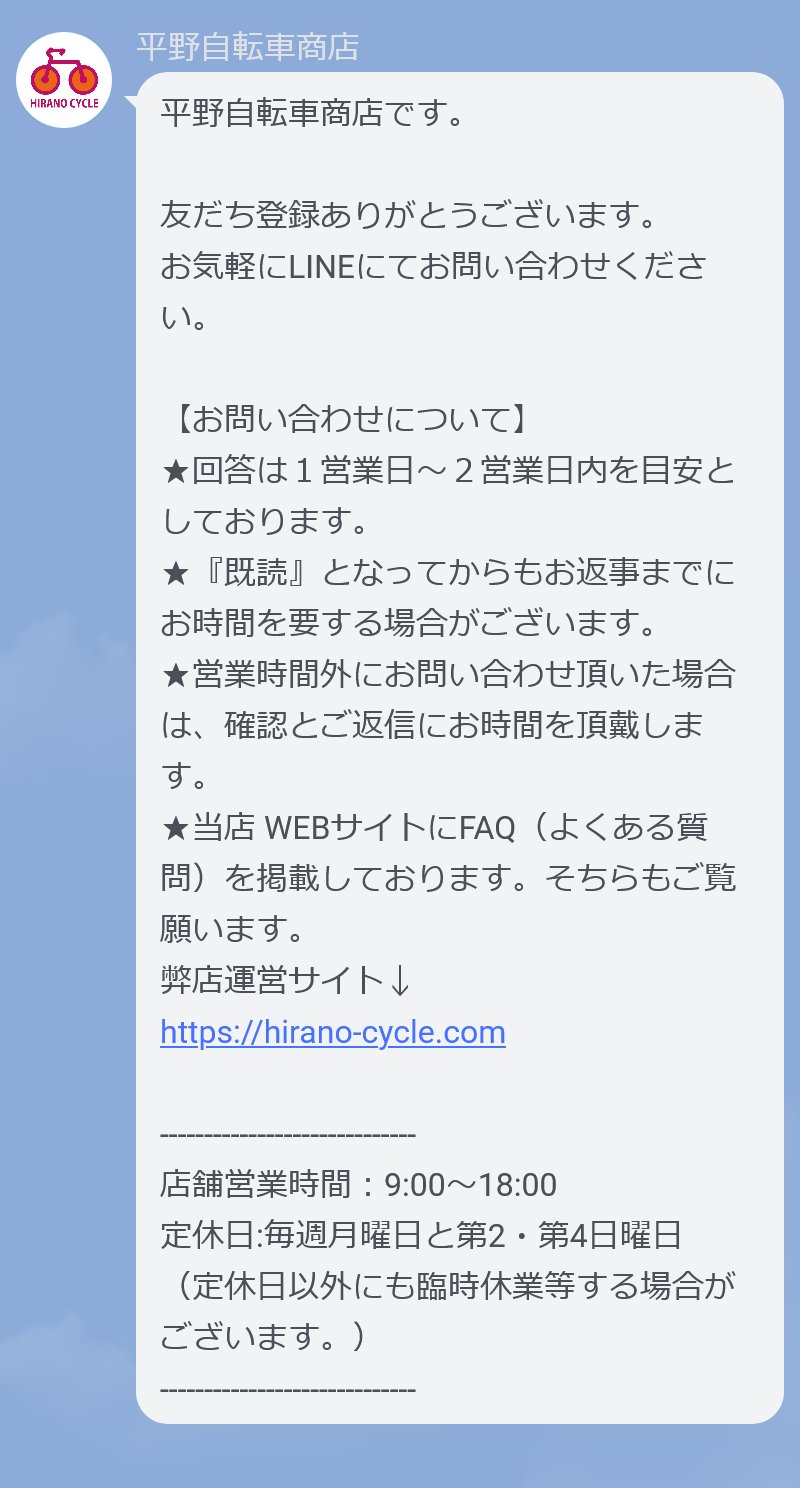 当店でご購入ご検討頂ける方は、当店のLINE公式アカウントよりご相談もして頂けます。ひとまずどんな感じの自転車がいいかなどお気軽にご相談下さい。 -