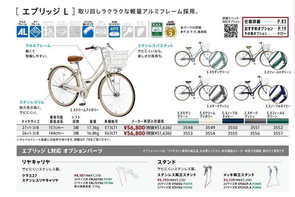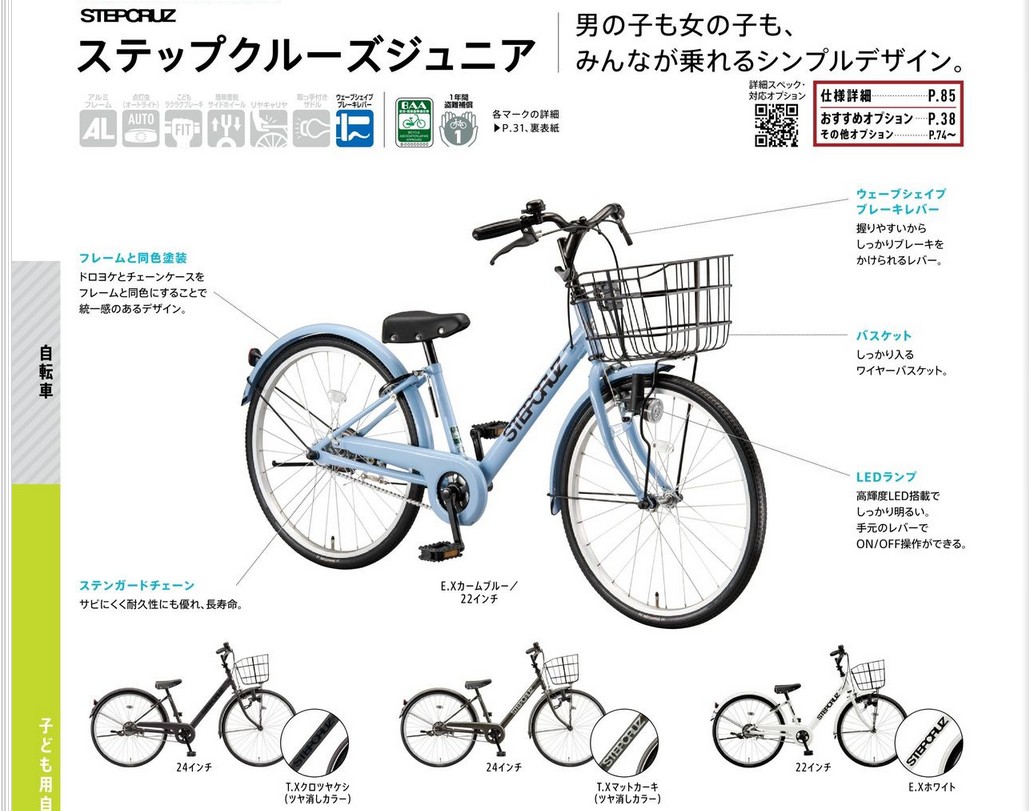 - リアキャリア&両立スタンド取付モデルに前カゴを通学向けによりふさわしい深めのステンレスワイヤーバスケットに変更した特別仕様車です。