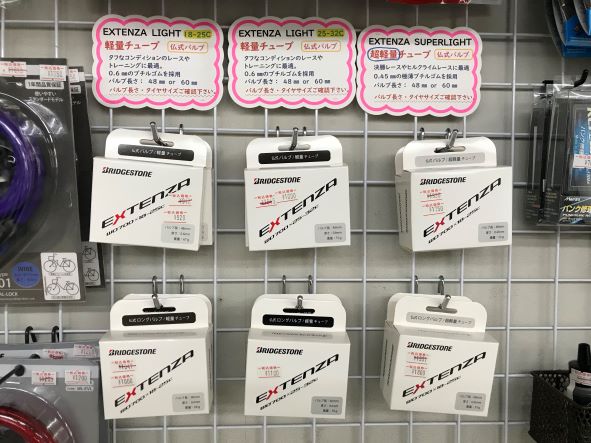 - タイヤサイズ、チューブの薄さ、バルブ長違いで6種類あり。